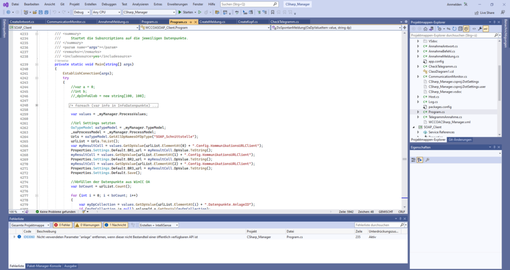 Um die Meldungen und Alarme aus dem SCADA-System WinCC OA an das UELS (übergeordnetes Leitsystem) wie auch an weitere unterlagerte Systeme zu senden, musste eine XML-SOAP Schnittstelle entwickelt werden. Diese wurde mittels der Programmiersprache C# in .NET entwickelt.